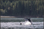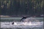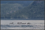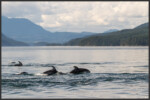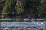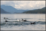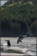 In the waters of Discovery Passage around Vancouver Island we were lucky to come across a pod of Pacific white-sided dolphins (Lagenorhynchus obliquidens) that we were able to watch for a considerable time. The species is of average size and its colours make it relatively easy to identify in the field. The Pacific white-sided dolphin has a dark grey back, flippers and dorsal fin, contrasting against its off-white chin, belly and throat. On the sides they have light grey patches with a stripe in the same colour that runs all the way from above the eye down to below the dorsal fin. White-sided dolphins are highly sociable animals who like to swim and hang out in close-knit groups between 10 and 100. They form very close social bonds and regularly look after injured or sick individuals. They use a number of different vocalizations such as whistle-sounds and clicks to communicate with and to recognise each other.